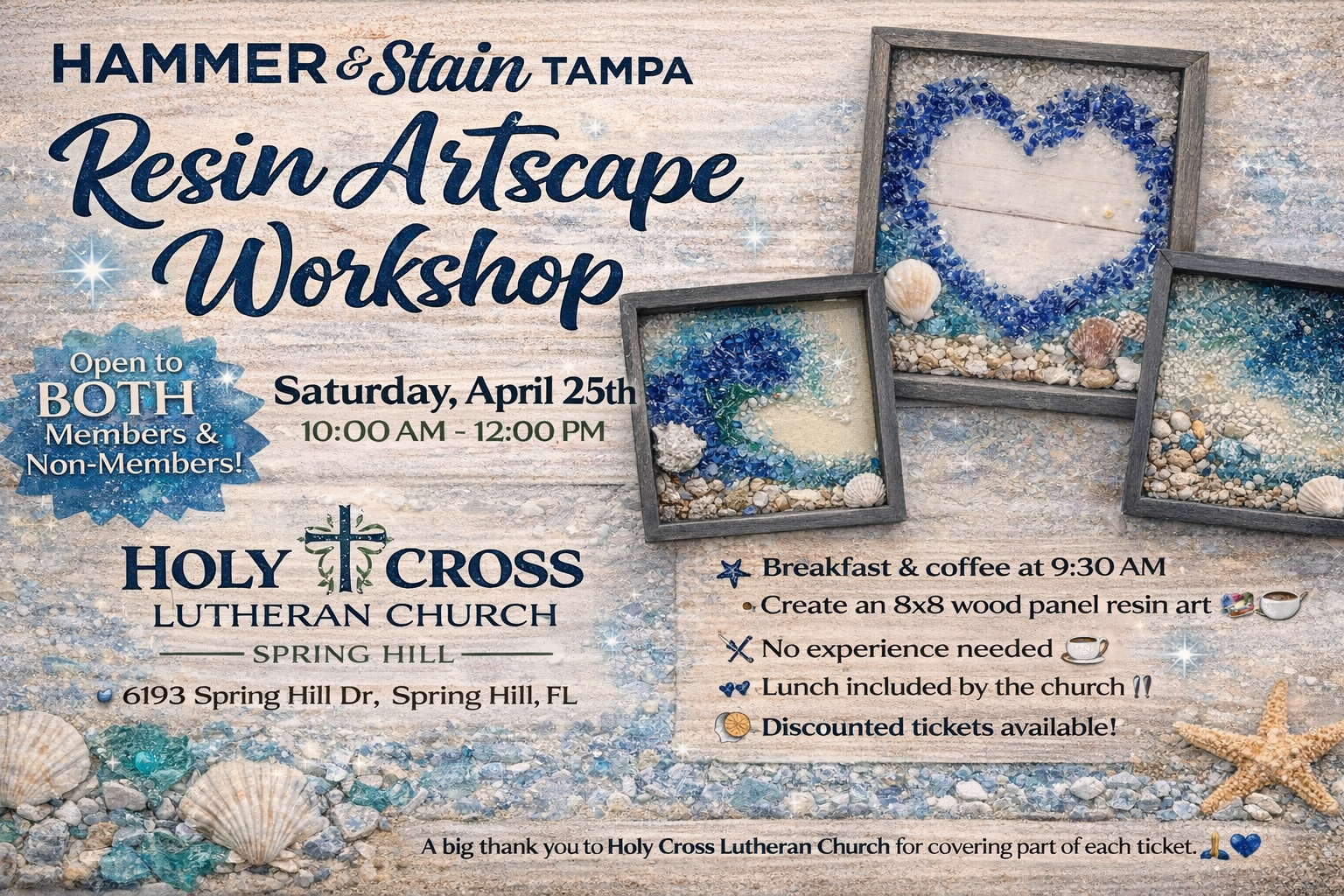 Join us at Holy Cross Lutheran Church in Spring Hills on Saturday, April 25th from 10 AM–12 PM for a special Resin Artscape Workshop open to both members and non-members of the community.